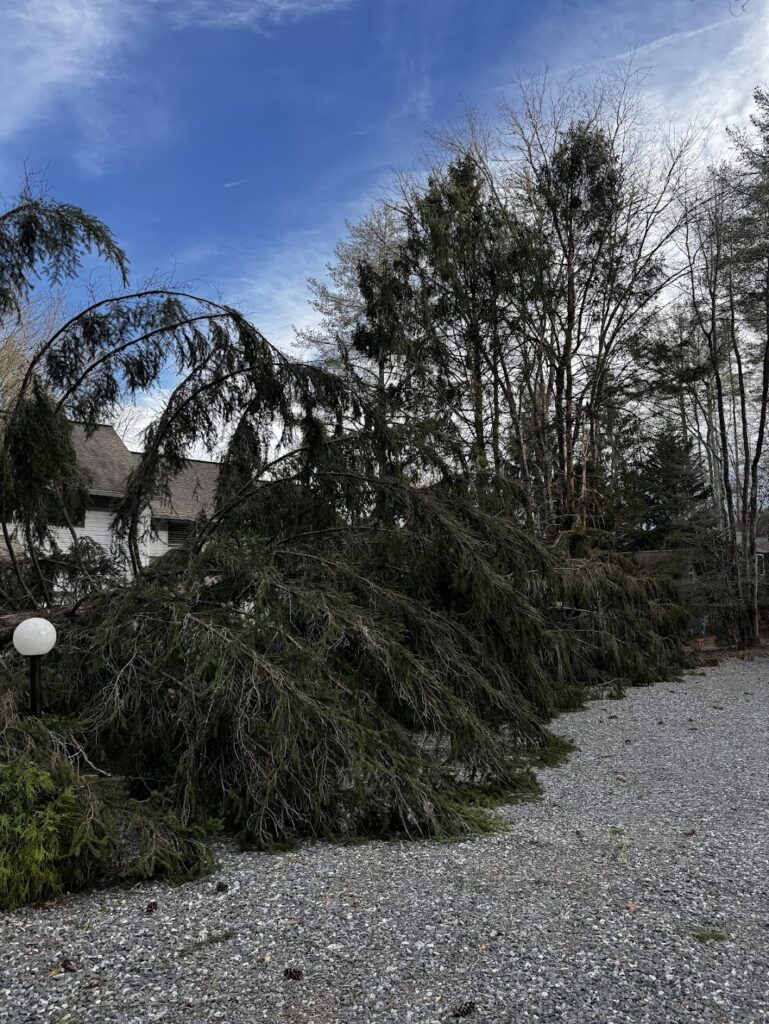 We try to keep up with keeping trees trimmed and taking ones down that have died (it’s a constant thing) but it does not always mean that we don’t have rogue branches that fall on our driveway during windy times or ice storms which do happen occasionally.