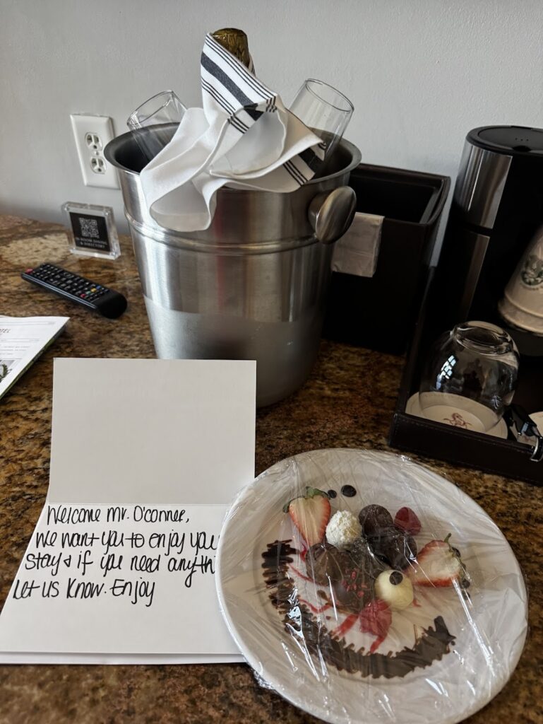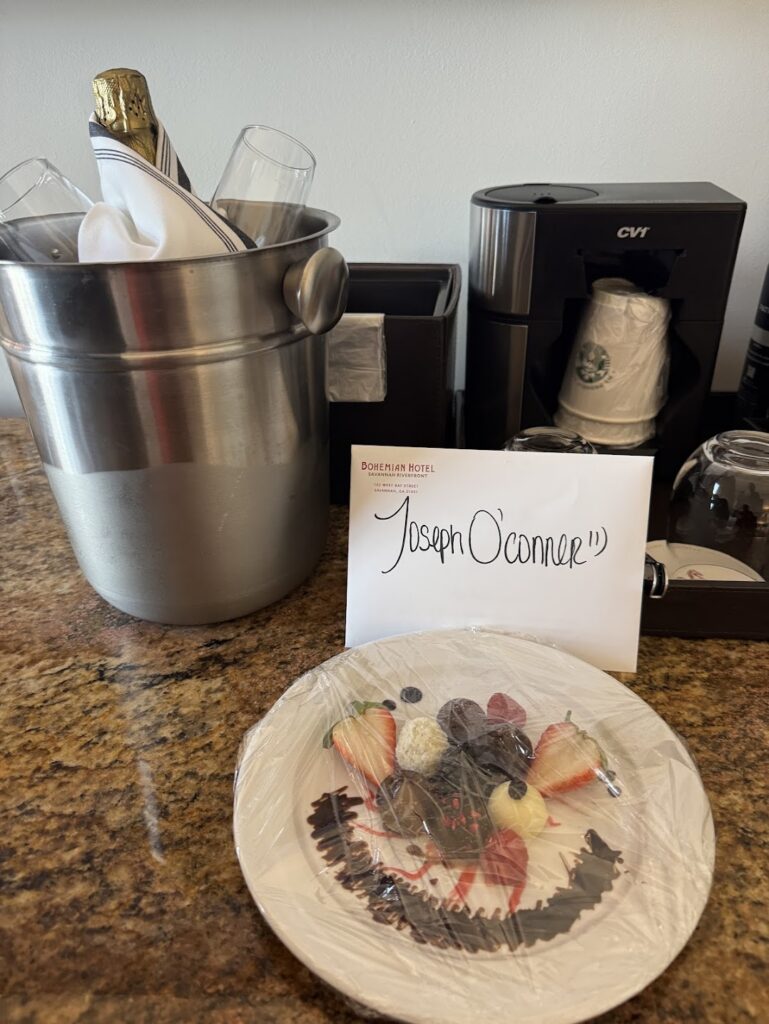 We stayed at The Bohemian Hotel Savannah and when we checked in we were greeted with a glass of champagne, bottles of water and the offer of any information we needed. How lovely. We went to our room and discovered this.