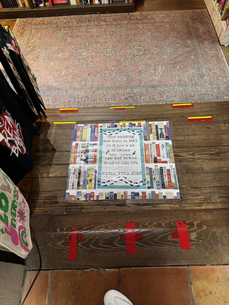 A sign on the floor warns the customers that the building that was built in 1843 has lots of twists and turns and uneven spots.